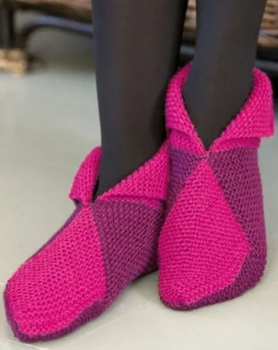 Начинаем вязание следков из квадратов с набора спицами 19п. Провязываем на высоту 9см и закрываем п. Изготавливаем по 8 квадратных заготовок каждого цвета для одного тапка. Всего для двух следков по 16 шт. каждого цвета. Сшиваем следки из квадратов по указаниям схемы, чередуя цвета.