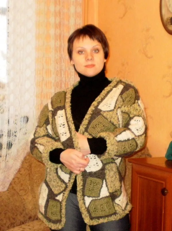 Сегодня перебирала вещи и в дальнем углу шкафа обнаружила вот такую вещицу. Связана она давным-давно из остатков пряжи крючком. Связана для дочки, но она носила ее мало, поскольку по ее мнению, она слишком колючая. По этой причине жакетик задвигался все дальше и дальше. Периодически я его вытаскивала на свет божий, щупала, рассматривала, раздумывала, что с ним делать. Распускать себе дороже. Связан из маленьких кусочков, а выбросить жалко. можно было бы подарить, но, честно говоря, некому. Вот сегодня окончательно решила - пусть едет на дачу. Там хоть вместо подстилки на стул сгодится. но прежде, чем списать его окончательно, решила показать вам.