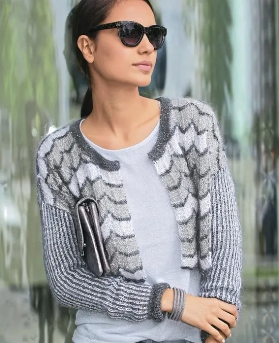 ВАМ ПОТРЕБУЕТСЯ: пряжа (75% мохера, 25% шелка; 225 м/25 г) – по 50 г белой и серой, 25 (50) г серебристой; дополнительная пряжа с пайетками (100% полиэстера; 185 м/25 г) – 75 г платиновой, 50 (75) г антрацитовой; спицы №5 и 6.