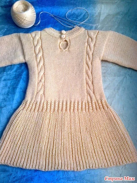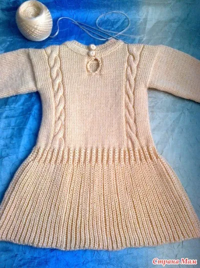 Коса из 8п перекрест в каждом 10р к центру платья, справа и слева от косы по 2 изн. п. ( в каждом 8 ряду между изн. п. я добавляла 1изн. п., чтобы не стягивало, и в каждом 12 ряду убирала ее провязав вместе с соседней изн. п.- этого можно не делать ).