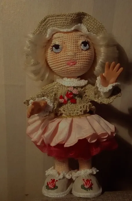 Высота куколки 25 см, стоит самостоятельно, одежка снимается частично. Милочка выполнена в смешанной технике: крючок/текстиль/глина. Ниточка основы полухлопок. Куколка изготовлена на проволочном каркасе. Лицо без утяжки, но с тонировкой