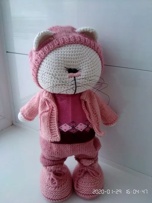 Добрый день дорогие рукодельницы! Моя новая работа вот такой котик получился. Связала из пряжи YarnArt JEANS крючок №2, размеры игрушки рост 34 см, длина ручки 11,5 см,высота тела 17 см,окружность 31 см,длина стопы 9,5 см,ширина 6,5 смм, окружность головы 38 см. Одежду вязала спицами, пряжа ALIZE lanagold. Одну футболку сшила из носка.