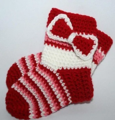 5. Украшаем наши носочки бантиками. Для бантика связать прямоугольник столбиками без накида, обвязать по кругу пряжей другого цвета и стянуть посередине нитью.