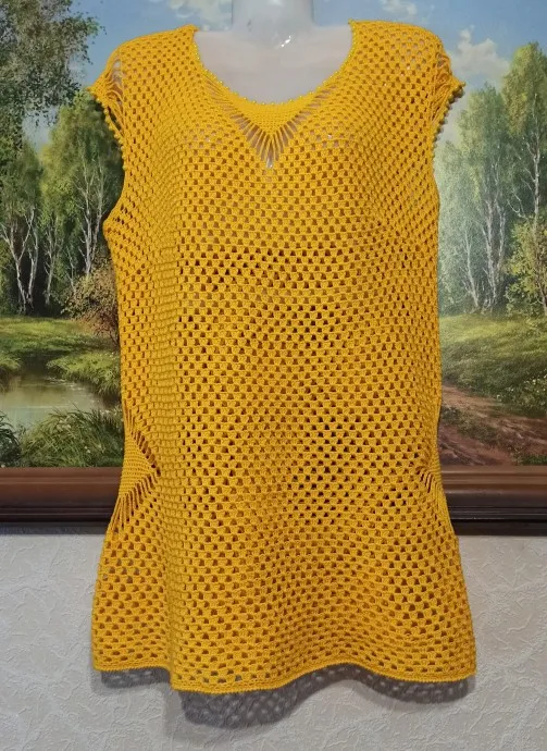 У Вас получился замечательный летний топ, красивый, яркий — действительно солнечный.