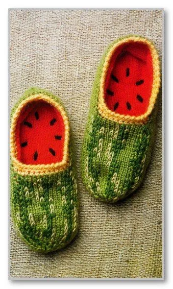 Темно-зеленой и желтой нитями вышейте на передней части тапочек полоски, как показано на фото. Выполните шов на пятке.