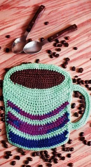 Можно связать кружку полосками разных цветов. Для ручки свяжите 30 возд. п. и по ним провяжите один ряд ст. б/н.