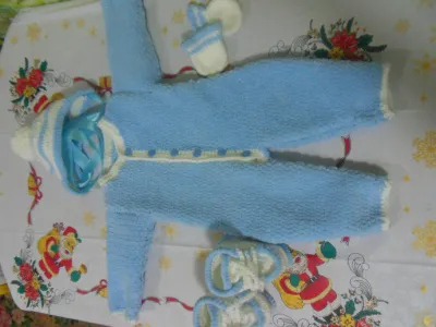 Можно использовать для выписки. Плед на подкладке 80*80, комбинезон, пинеточки, шапочка и царапки. Выполнен из плюшевой пряжи Teddy плюш, состав: 45% шерсть, 30% полиамид, 25% акрил.