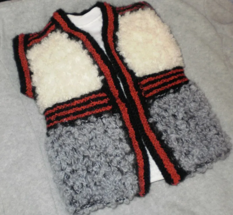 Из остатков буклированной пряжи белого и серого цвета сочинила вот такую душегреечку для своего младшенького внучка. К буклированному мохеру добавляла еще полушерстяную нитку белого и серого цвета соответственно. Для отделки использовала нити красного и белого цвета. Вязала спицами снизу. Сразу полочки и спинку одним полотном. После проймы вязала отдельно спинку и каждую полочку. А затем сшила и обвязала бейками.