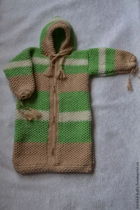 Связан он спицами из детской пряжи Пехорка "Детский каприз" (50% шерсть "меринос", 50% микрофибра) , в две нити ( цвета выбирала сноха), красивым объёмным узором "соты". Предполагалось, что застегиватся он будет на пуговицы, посредством навесных петель (на фото - без пуговиц). Но потом решила пришить молнию, и оставить пуговицы, так теплее, апрель не лето! На капюшоне выполнена кулиска с вязаным шнурочком для плотной фиксации на голове малыша. Такая же кулиска и на рукавах, можно зафиксировать шнурок на запястье малыша или при, необходимости, затянуть шнурок - и получится закрытый рукав (будет тепло и без варежек).