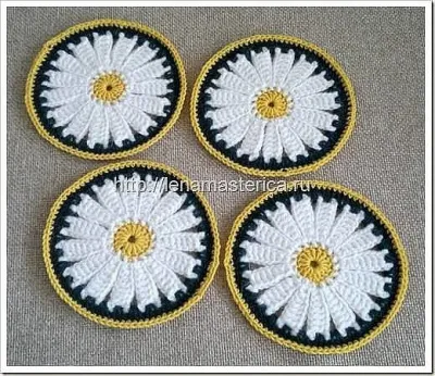 Хватит пачкать свою мебель отпечатками чашек и стаканов! Пора избавиться от лишних следов и сделать свой дом еще уютнее благодаря вязаным подставкам в виде ромашек. Можно выбрать любое сочетание цветов, сделать более светлый фон, нежели черный. Надеюсь, данная публикация будет полезна и вам, дорогие коллеги по вязанию!