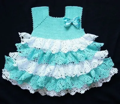 Чудесное платьеце! С рождением внучки стала искать схемы на такую красоту. Только не найду подробное описание — сперва вяжется сетка и потом воланы или как иначе? Для меня вопрос.
