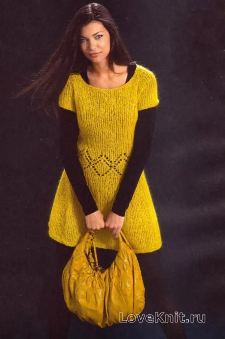 Размеры: 36/38 (40/42) 44/46 Вам потребуется: 150 (200) 250 г жёлтой пряжи (45% мериносовой шерсти, 40% мохера, 15% полиамида, 200 м/50 г); прямые и круговые спицы длиной 80 и 60 см № 5,5.