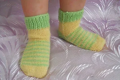 Вяжем 14 рядов (=8 см) лицевой гладью, соединяя заднюю часть манжета с передней тем же способом, что и подошву со ступней. Выполняем 14 рядов (=8 см) резинки 1х1 и петли закрываем. Ниточку отрезаем, а ее кончик затягиваем и прячем на изнаночной стороне изделия. Носочек готов.