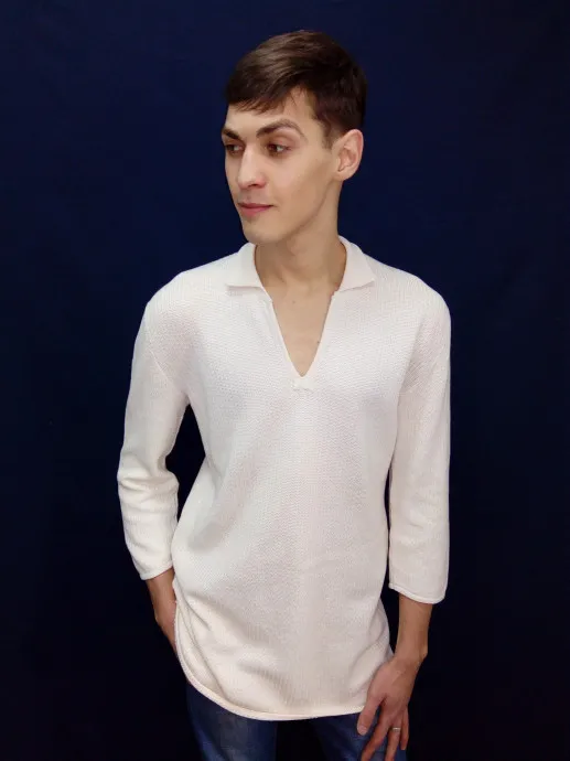 Рубашка мужская связана из 100% хлопковой пряжи, свободного кроя,с воротником и V - образным вырезом горловины, рукав три четверти, снизу по бокам небольшие разрезы. Эта одежда приятна к телу. Мягкая и эластичная текстура хлопковой пряжи позволяет телу дышать, чувствовать комфорт и при этом хорошо выглядеть, изделие прекрасно сидит по фигуре, подчёркивая все её достоинства.