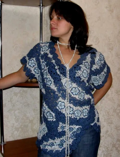 Спасибо! времени ушло сравнительно мало. Дело в том, что у меня был связан небольшой жакетик из ленточного кружева. Он мне не нравился и я его разобрала на отдельные полосы. А потом решила их использовать для изготовления нового изделия.
