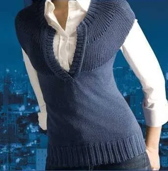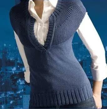 Сборка. Выполнить плечевые и боковые швы. Для планки горловины переда набрать справа по краю выреза 60 п. и связать 1 см лицевой гладью. Затем связать 1 ряд следующим образом: * 1 накид, 2 п. вместе *; повторять от * до * до конца ряда. Продолжить вязание резинкой 2/2. На общей высоте 3 см закрыть петли по рисунку. Левую планку вязать аналогично. Наложить правую планку на левую и пришить внизу выреза горловины потайными стежками.