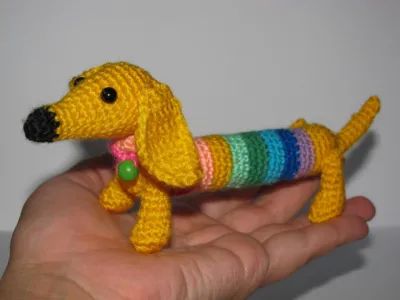 Длина вязаной таксы амигуруми — 15-16 см без хвоста.