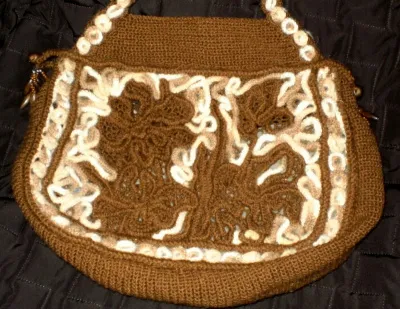 Сумочка выполнена в смешанной технике вязания крючком. Нижняя и торцевые части связаны одним прямоугольником. Узор самый простой - столбики без накида. Боковинки выложены отдельно связанными шнурочками. Эти шнурочки еще называют гусеничками. Делала их разной длины, чтобы удобнее было работать. Из коричневых гусеничек схематично выложила ирисы, остальное пространство заполнила гусеничками другого цвета.