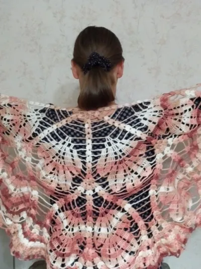 А я вязала по такой схеме салфетку-скатерть на журнальный столик. А вот шаль подумывала связать, но я бы вывязала шесть клиньев и перемычки из воздушных петель чуть покороче. Но это мое видение. Ровных вам петелек.