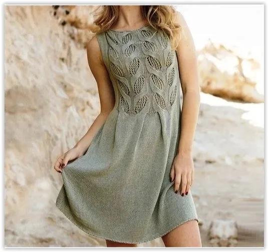 Это симпатичное летнее платье связано спицами: низ выполнен лицевой гладью, а верх изысканными ажурными «косами».