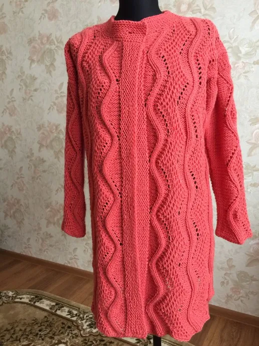 Алочка, здравствуйте. У меня в закладках есть кардиган «ажурный ручеек». Планки другие, узор очень похож. Модель из японского журнала. Ваш очень похож, но никак не решусь на работу. Сложно было? Как Вы думаете, эта модель из акрила будет смотреться? Хочется именно корал, как у Вас, и вариант весна-лето. Вы делали влажно-тепловую обработку?