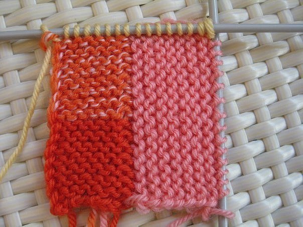 Сначала вяжут прямоугольник таким образом набирают 8 петель, вязать квадрат ниткой одного цвета. Затем сменив цвет нити, провязать столько же. Затем набирают петли по боковому краю связанного и вяжут поперек первой полоски.Таким образом надвязывают полосы по всему периметру прямоугольника. Когда прямоугольник достигнет нужной величины. петли по краям закрывают.Связать таким образом несколько прямоугольников, запрятать края нитокс изнанки в вязание и соединить прямоугольники, закрепить и сшить их в одно полотно. Край пледа также обвязать платочной вязкой.