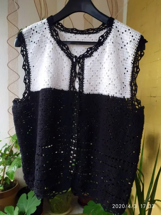 Связала дочке жилет крючком, нитки х.б. Хотела цвета немного по другому распределить, но дочка сказала, что внизу полоску белую не надо. Это связано со спецификой ее работы, работает она водителем троллейбуса, так что внизу будет очень пачкаться. Крючок по-моему №2. Еще не стирала, это дочка сделает сама.