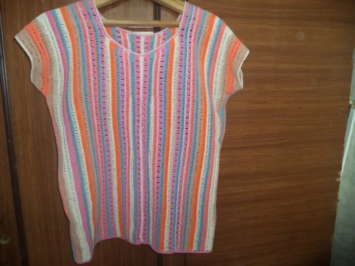 Собрала все хб нитки толще ириса, остатки, как у меня всегда получается и решила связать блузку крючком, начиная от рукава. Встреча частей в середине. Крючок 3.5, Столбики с накидами. Не яркая, не нарядная, я её про себя называю "мой матрац". Но в ней так хорошо в жару!