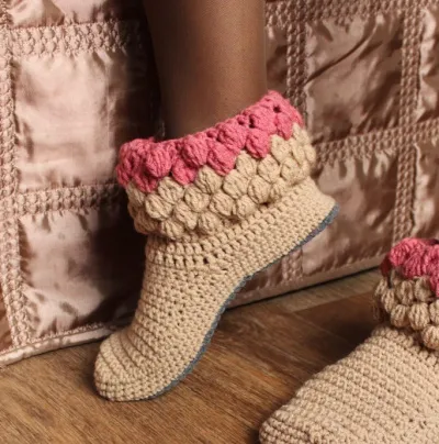 Ну и последняя пара — крючок. Подошва или берётся готовая — стелька войлочная, к примеру. Или вяжется. В инете можно поискать. А далее обвязка — 4 ряда столбиков без накида вкруговую. Потом похоже, что вывязывается поворотными рядами теми же столбиками без накида носочек. Потом 3 ряда полустолбиков с накидом по кругу — это подъём. Ну и далее 3 стобика с накидом, попкорн. Следующий ряд — над средним столбиком с накидом попкорн, далее 3 столбика с накидом. То есть группа из столбиков и попкорн вяжутся в шахматном порядке.