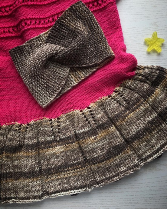 Довязала я платье для внучки и повязку на голову. Пряжа цвета фуксии ушло чуть меньше моточка. Пряжа коттон голд от Ализе. В 100 гр 330 метров, 55% хлопок, 45 % акрил. спицы 3. И ещё моточек пряжи меланжевой от Нако Калико Жакар в 100 гр 245 метров, состав 50/50 акрил с хлопком. Изделие без ВТО, не судите строго)))