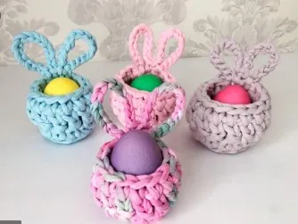 Красивые корзинки зайчики цыплята - вязаные идеи к Пасхе из трикотажной пряжи