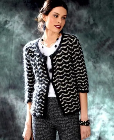 Классический строгий жакет в стиле Шанель не теряет своей актуальности. Нотку мягкости придает этой модели использование пушистой пряжи с мохером.