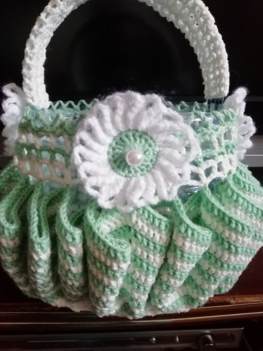 Эту корзинку я нашла в просторах интернета, и захотелось связать такую же для разных мелочей. Основание у неё от пластиковой пятилитровой бутылки. Она отлично смотрится в интерьере и в ней удобно хранить клубочки и прочие и рукодельные принадлежности.