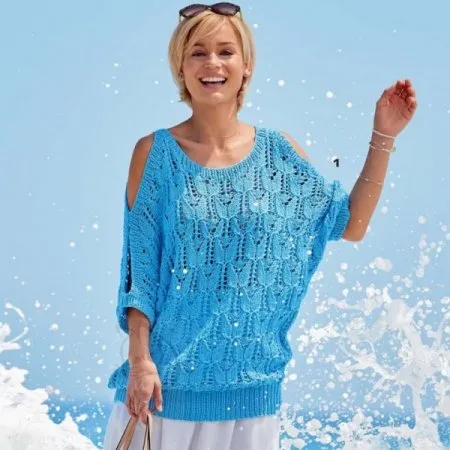 Вам потребуется: пряжа (100% хлопка; 80 м/50 г) - 550 (650) г васильковой; спицы № 4 и 5; круговые спицы № 5.