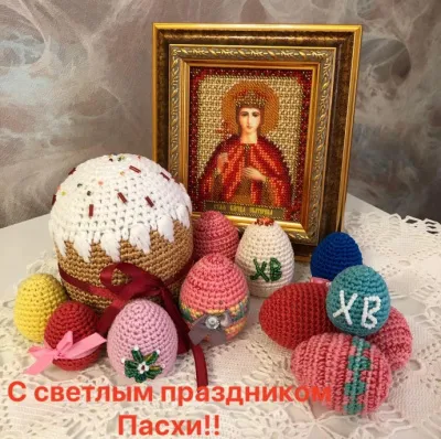 я набиваю синтепухом связанную форму яйца и кулич также.