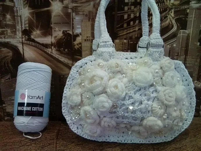 вяжем крючком. Белая сумка пряжа макрамэ коттон хлопок толщина 3 мм.