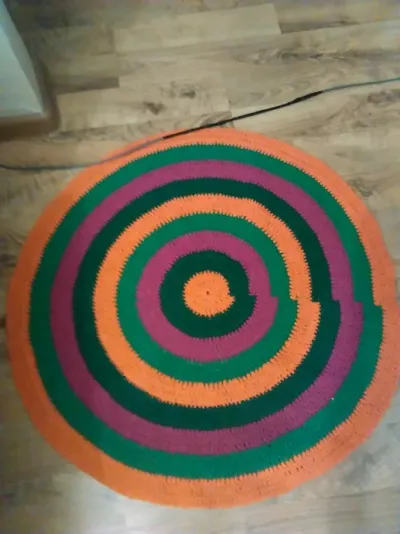 Довязала новый коврик, диаметр 100 см, и снова кавказская пряжа, никак не иссякнут ее запасы. Наверное, буду ставить кросны и ткать из нее половики.
