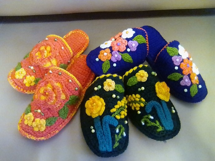 тапочки домашние связанные крючком, украшенные вязаными цветами и бусинами.