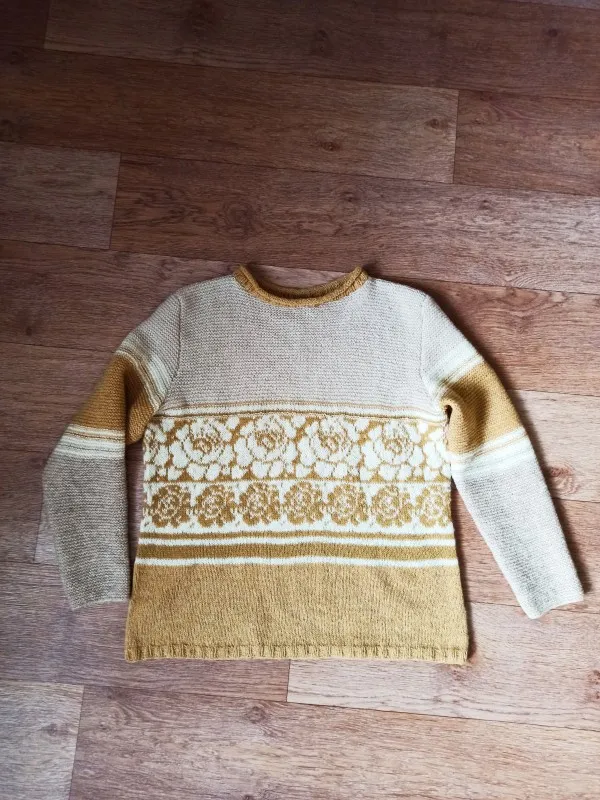 Недавно довязала чудесно лёгкий и теплый свитер с частичным цветочным жаккардом. Теперь на весну он явный фаворит - размер 42-44, весит всего 230г - это просто невероятно!