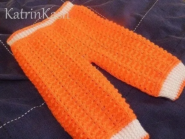 Свяжите штанину до нужной высоты. Затем свяжите вторую штанину. Соедините обе штанины, набрав между ними несколько петель, и убавляйте по 2 крайних петли в каждом ряду в середине между ножками. Свяжите штанишки до нужной высоты.