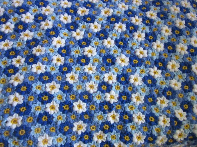 Увидела в инете детский плед "Цветочная поляна". Очень уж мне захотелось связать такой для моего внука. Он тогда был ещё в коляске. Плед связан в сине-голубой цветовой гамме.Было связано более пятисот цветочков. Результатом я осталась довольна.