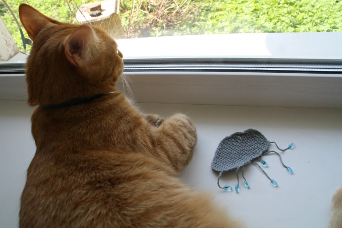 Маленькая, вовсе не грозная тучка, крючком, из ниточек Yart Art Flowers. Ну так вот мне привиделось, что просто кофточка без украшалки будет скучноватенько, ниток осталось всего ничего, и как-то само собой исходя из их цвета придумалось: будет тучка! Как нельзя лучше подошли пришивные бусинки-капельки для декора. Идея вобщем не моя, взята с просторов интернета. Просто набрала в яндексе "туча крючком" и нашла для себя устраивающий меня дизайн (естественно получилось в итоге что-то своё :))))).