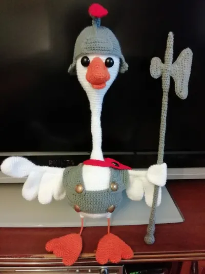 Здравствуйте, дорогие рукодельницы! Представляю Вам свою последнюю работу "Гусь Яша". Мой рыцарь связан по МК Защитник Рима" автор jabida-02. Рост Яши 50 см, стоит на проволочном каркасе.Вязаное копьё - это моя фантазия.Связан из пряжи "Детская новинка". Я не ожидала, но результат меня приятно удивил. Интересный такой гусь получился. Надеюсь, Вам тоже понравится Рыцарь Яша.