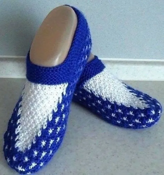 Складываем вязание по тому ряду, где у нас накиды и соединяем начальный ряд с последним путём вывязывания: 1 петля с первого ряда и одна петля с последнего ряда провязать вместе лицевой. Затем подключаем в работу петли с булавок и вяжем платочной вязкой высоту тапочка 3-4 см тёмной нитью.