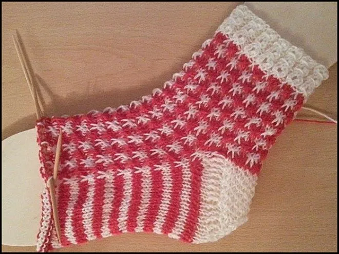 Повторять эти шесть рядов на желаемую высоту. Последний ряд должен быть провязан красной нитью, т.к. пятка вяжется белой.