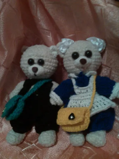 Мишки связаны из велюровой пряжи. Одежда снимается. Могут сидеть и стоять. В комплекте письменные принадлежности. Рост 15 см.