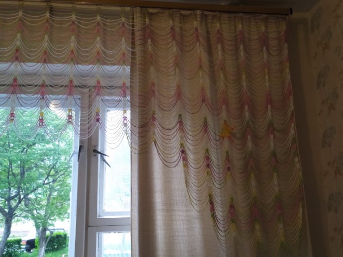 Пряжа Alize DIVA 100% микрофибра акрил Вес100 г Длина нити 350 м. Ушло 500 гр. Это меланжевая пряжа. Нитки очень хороши для шторок. После стирки сразу вешала в мокром виде. Гладить не надо. Спасибо интернету за идею! У меня было мало ниток и я рисунок немного изменила. А еще шторки хорошо смотрятся на балконе, в особенности — с улицы.