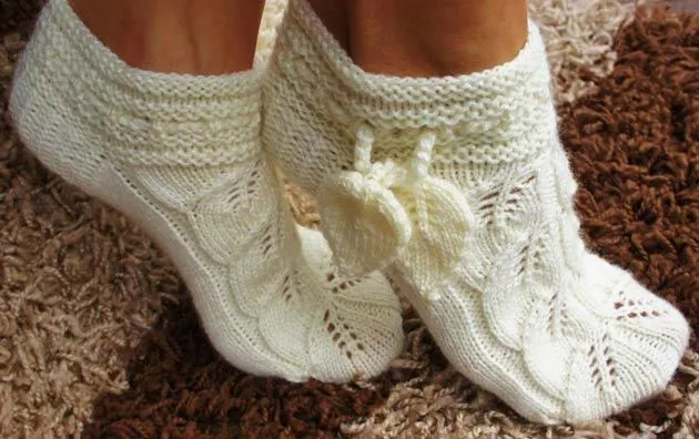 Поистине шикарные носочки-тапочки, вязаные спицами ажурным узором из листочков.