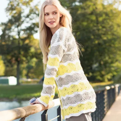 СБОРКА Кокетку полочек пришить к внешним по 28 (45) п. спинки. Для планки желтой нитью набрать на круговые спицы по краю горловины 122 петли и связать 6 рядов платочной вязкой. Затем закрыть все петли, как лицевые. Для планок застежки желтой нитью набрать по борту каждой полочки, включая конец планки, по 122 петли и также связать 6 рядов платочной вязкой, при этом на правой полочке в 3-м ряду выполнить 7 отверстий для пуговиц следующим образом: 2 петли провязать вместе лицевой, 1 накид. В следующем изнаночном ряду накид провязать лицевой. Первое отверстие для пуговицы выполнить на уровне 2-й ажурной полосы от нижнего края, остальные 5 отверстий для пуговиц выполнить на уровне каждой последующей ажурной полосы, 7-е отверстие для пуговицы выполнить в начале планки горловины.Вшить рукава, выполнить боковые швы и швы рукавов. Пришить пуговицы.