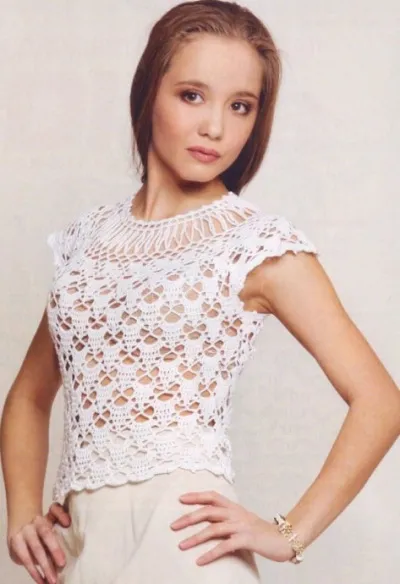 Вязание топа: связать цепочку из возд. п. длиной 54 см и вязать прямыми и обратными рядами основным узором. Через 16 р. от наборного края отметить контрастной нитью центры переда и спинки и оставить для рукавов по 4 раппорта. На петлях спинки выпопнить 1 раз 11-й 12-й р. основного узора, затем вязать на петлях спинки и переда круговыми рядами основным узором, выпопнив при необходимости между деталями цепочку из 3-5 возд. п. Для приталивания выполнить убавление по бокам по выкройке. Через 36 см от начала проймы работу закончить. Вырез горловины и разрез на спинке обвязать 1 р. ст. б/н с «пикО». Нижний край и рукава обвязать каймой